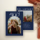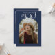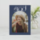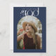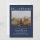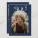 um script de tipografia moderna Limpa e Chic com um quadro fotográfico arquivado sobre fundo marinho+azul. Personalize facilmente as suas fotos de formatura e os detalhes do convite na frente e no verso.