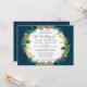 "Marinho Dourado Natal Pine Cone Greenery Convite para Casamento." Layout de formato horizontal de 5" x 7". Um rico fundo azul-marinho dispara o elegante verde-aquarela moderno com cones de pínus, folhagem de folha, folhas sagradas e bagas com folhagem dourada. Há também um espalhamento de ouros suaves que se repete no lado oposto. A trabalho de arte de Watercolor foi criada por uma artista internacionalmente licenciada, Audrey Jeanne Roberts. Direitos autorais.