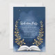Celebre a realização acadêmica com este elegante e clássico convite à festa de formatura. Um fundo azul marinho profundo é belamente complementado por galhos ouros, simbolizando honra e vitória. Um livro aberto no fundo significa conhecimento e aprendizagem. O design é adequado para qualquer tipo de grau. Adicione um toque pessoal com uma foto do formando!