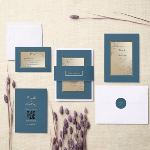 Convites Marinho Dourado Retângulo Floral Boho Casamento