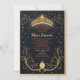 Este Convite de festas Quinceañera tem belos detalhes de ouro nas esquinas com uma bela coroa artística no centro. As cores são marinho e ouro. E muito espaço para preencher todos os detalhes maravilhosos para uma gloriosa festa de margarida.