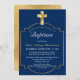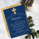 Celebre o batismo do seu bebê com amigos e família convidando-os com este convite de batismo elegante para meninos de ouro falsos. Este design apresenta uma bela cruz de ouro com um quadro de ouro contra um fundo azul marinho simples e elegante. Personalize o texto e a fonte ao seu gosto que inclui o nome do seu filho, a localização do batismo, as suas informações de recepção e as suas informações de RSVP. Outras fontes e estilos disponíveis. Por favor, entre em contato conosco com seu pedido especial e ficaremos felizes em ajudá-lo.