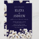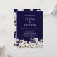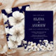Este marinho elegante e os recursos de convite floral branco caem e flores de inverno. Fundo do marinho mostrado com texto branco e flores para casamentos brancas. O fundo de grandes florais brancos é opcional. Todo o texto, incluindo nomes, pode ser alterado.