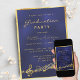 Um cartão de convite para uma festa de formatura de 2025 (ou qualquer ano). Glamoroso com elegante e moderno fundo azul e clássico do marinho e decorado com notas falsas de música dourada. A cor azul é irregular. Modelo para detalhes de nome e festa. Com uma falsa armação de ouro. O texto Graduação e o nome são escritos com um script de estilo manuscrito moderno. Ouros. Fundo: fundo azul com notas de música de ouro.