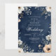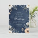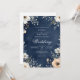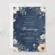 Um fundo de marinho escuro apresenta um delicado arco floral, com flores brancas e mudas de pêssego e verde. Esta design evoca um clima de romance sofisticado e beleza natural.