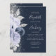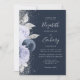 O canto esquerdo deste elegante convite para casamento moderno apresenta um buquê floral em tons de azul marinho e lilás pálidas, aparado com folha de falso prateado e folhagem falsa e aspergido com brilho de prata. O texto personalizável combina o script de escrita manual de cinzas prateadas, fontes copperplate e itálico em um fundo azul marinho. O verso apresenta um design floral correspondente.