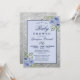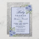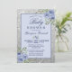 Marinho Floral Blue Silver Sparkles Chá de fraldas Convite O design apresenta buquês de flor floral azul clara e azul marinho escuro em um azul claro e cinza prateada brilha no fundo.