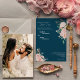 Este marinho floral brilhante nada de fotos de rico convite de casamento design de mostra belas paisagens clássicas em chic de rosa pastel e azul marinho com simples tipografia moderna e caligrafia elegante para dar um tom sofisticado a qualquer estilo de evento. Cada produto é embelezado com rosas rosas rosadas e escamosas, cor-de-rosa, bem como fitas de pêssego e de marfim, dispostas com eucalipto e detalhes de folha verde, bem como armações geométricas de ouro de eterno para um aspecto luxuoso. Misture e combine esta coleção coordenadora para uma estética de casamento de sonho personalizada sem esforço para uma grande variedade de estilos casuais e formais. Para designs mais coordenadores, esse design também está disponível em branco e preto. Tal como acontece com todos os nossos design, se tiverem perguntas ou pedidos especiais, por favor, perguntem.