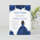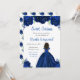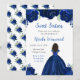 Este doce 16 convite apresenta flores azuis marinhos brilhantes e flores florais e uma bela princesa com pele escura e um vestido elegante. Isto é perfeito para uma doce festa de aniversário de dezesseis.