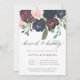 Este belo chá de panela de brunch e convite à espuma apresenta marinho azul, azul, roxo ameixa, flores cor-de-água cor-de-rosa-pincelada e folhas botânicas e folhagem verdes. A caligrafia azul-marinho elegante acrescenta um toque clássico, e o texto principal é uma mistura moderna de marinho e ameixa, tudo sobre fundo branco. A parte de trás do convite contém mais gráficos florais em um fundo azul escuro correspondente.