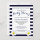 Um convite para chás de fraldas moderno com listras azuis e brancas e pequenas flores margaridas na parte inferior ============DESIGN TIP==================== Use o botão personalizar para redimensionar e reorganizar qualquer texto que não funcione após a personalização.