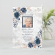 Um belo funeral moderno ou um convite de serviço memorial com uma fotografia do falecido sobre um fundo de mármore falso carrera, decorado com rosa de aquarela em azul marinho e cor-de-rosa esbranquiçada. A parte traseira da placa apresenta uma textura de traçado de aquarela em azul-marinho. Copyright Elegant Invites, todos os direitos reservados.