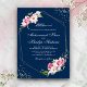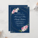 Convide seus convidados com este elegante convite de casamento com lindas flores rosa com falso quadro de hexágono de folha de ouro e 'Bismillah' na caligrafia árabe sobre fundo azul marinho. Basta adicionar os detalhes do seu evento neste modelo fácil de usar para torná-lo um convite de tipo único. Sacudir a placa para mostrar um padrão de pontos azuis e dourados na parte traseira da placa.