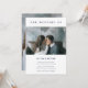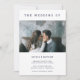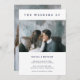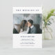 Este convite de casamento simples e elegante apresenta um texto azul moderno e marinho sobre um fundo branco de chic. Há espaço para duas fotos pessoais, uma na frente e outra atrás.