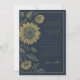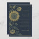 Celebre seu dia especial com este elegante convite para casamento azul de marinho, com flores de sol amarelas ouros ao longo da margem esquerda e um texto refinado e minimalista à direita. O estilo botânico vintage e a tipografia serif limpa criam uma aparência eterno — perfeita para casamentos rústicos, jardins ou finais de verão. Os tons do ouro são impressos, não metálicos ou folhas. Totalmente personalizável com seus detalhes de casamento.