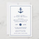 Convites náuticos à náutica, com âncora azul marinho, com o monograma em ambos os lados e os detalhes do evento rodeados por uma fronteira, sobre um fundo branco. O anúncio no topo tem seu nome e as palavras, "é casando". Seu encontro é cercado por um círculo com o mês à esquerda e o ano à direita. A parte de trás é uma sombra correspondente de azul marinho. Um design simples, mas elegante, perfeito para uma celebração temática na praia no verão.