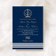 Design de convite náutico pré-disquete apresenta um monograma de casamento exibido dentro a âncora de barco com sotaques de corda e listras. Marinho azul, cinza e cognac como esquema de cores castanho.