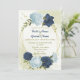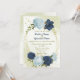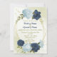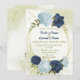 Belo convite para o casamento, com marinhos e flores azuis empoeiradas e folhas verdes em uma elegante estrutura geométrica de ouro. São simulados os detalhes do brilho dourado. É adequado tanto para os convites para o casamento como para o noivado. PARA MAIS PRODUTOS CORRESPONDENTES, clique na coleção acima ou entre em contato comigo
