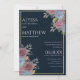 Uma aquarela cor rosa, azul marinho e convite floral para chic country de ouro. Este convite de casamento floral feito à mão por na moda botânico é perfeito para qualquer garota de na moda elegante e sofisticada ou qualquer outra pessoa. Este design é ideal para um evento de tendências e na moda. Personalize este design com sua própria mensagem e informações personalizadas. Todas as designs são impressas.