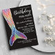Este Convite de festas de aniversário giro e fofo é a escolha perfeita para uma festa de Piscina divertida e excitante para a aniversariante e seus amigos. A design apresenta uma bonito e majestosa cor do arco-íris desenhada à mão ilustrada com a cauda da sereia no fundo preto superior. A cauda é pintada manualmente, rosa, azul marinho, cor púrpura, cor d'água, escala de sereia com esboço em branco. Esta design artística, tendência e adorável fará com que sua filha e seus convidados sorrirem.O fundo e a cor do texto estão definidos, mas podem ser alterados clicando no botão "personalizar".