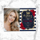 Elegante convite floral feminino para o 50º aniversário com sua foto. Design vermelho branco com marinho brilhante com ouro brilhante falso. Apresenta faixas marinho azul e branca, rosas vermelhas, fonte de script e confetti. Perfeito para uma festa de comemoração de na moda adulto. Personalize com seus próprios detalhes. Pode ser personalizado para qualquer idade! Impressos convites Zazzle ou modelo de impressão digital instantânea para download.
