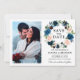 Azul-azul-escuro salve o cartão de data com buquê elegante de folhas azuis-marinhos, azuis-reais, brancas, rosa-esbranquiçadas e verdes-sábios de eucalipto. Entre em contato comigo para obter ajuda sobre a personalização ou se você precisar de outro produto com este design.