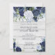 Um convite elegante com seus detalhes de casamento cercado por lindas flores em tons de marinho azul, branco e rico em um fundo de madeira branco rústico. Você pode adicionar sua própria mensagem especial e alterar o estilo da fonte indo para o menu personalizar. Este convite é parte de uma bela suíte de casamento que pode ser totalmente personalizada.