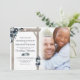 Convites de casamento russos azuis com um fundo branco de tendências que pode ser mudado para qualquer cor, um arco de casamento rústico em madeira, flores azuis poeirentas e marinhos aquáticas, um coração esculpido com as iniciais dos casais, uma foto da noiva e do noivo, e um modelo de casamento moderno.