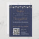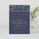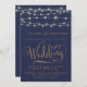 Apresentando nosso convite de casamento de design de madeira rústico modelo. Caligrafia romântica em ouro sobre fundo azul Marinho com detalhes de madeira e luzes de cordas revirantes decorando o topo do design. No reverso desta design, você pode adicionar todas as suas informações de casamento e detalhes de rsvp. Uma opção favorável ao orçamento de excelente.