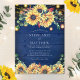 Estes convites para casamentos de cor de girassol apresentam um design de girassol de cor d'água com folhas de eucalipto, folhas de outono, frascos de pedras e luzes de cordas sobre um fundo de madeira azul marinho. Personalize-os com o seu texto. Produtos correspondentes disponíveis.