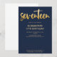 Introduza o novo moderno, elegante 17.º convite de aniversário com fundo azul marinho com texto de tipografia dourado escrito à mão que diz 17.º". Personalize esta placa de modelo, adicionando as informações de sua própria parte.