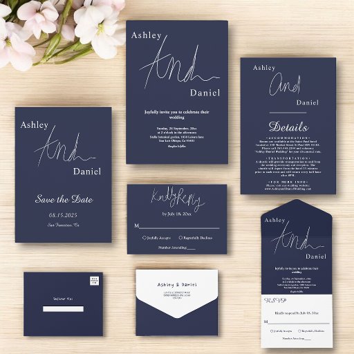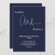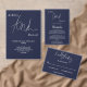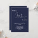 Este elegante convite de casamento azul marinho é perfeito para um casamento moderno. o simples design apresenta uma caligrafia branca elegante num fundo azul.