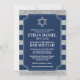 Este tradicional convite ao Bar Mitzvah em marinho azul e listras de cinza tem uma área de texto em forma de tíquete que é cortada em branco, juntamente com letras brancas que incluem um nome hebraico. Há uma grande estrela cinza de David acima do texto. A parte traseira tem texto de recepção opcional impresso em branco ou você pode comprar uma placa de gabinete de recepção separada. Exclua as palavras na parte traseira se quiser usar o cartão de recepção de coordenação.