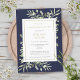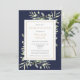 Uma elegante celebração personalizada do convite à lembrança de vida que inclui folhagem botânica de cor aquática verde num fundo azul marinho. Projetado por Thisnotme©