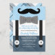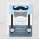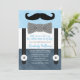 Este belo convite para chás de fraldas de homem é perfeito para um doce menino! Apresenta um bigode, gravata de arco e suspensórios em um esquema de cor azul, marinho e preto com xadrez na parte traseira.