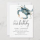 O convite perfeito para comemorar um aniversário especial de 50 anos com janto ao longo da costa, este design apresenta um caranguejo azul no canto superior em aquarelas vibrantes. O texto do convite é moderno com uma elegância casual que é saborosa e hospitaleira. Funciona lindamente para ele ou para ela e a idade pode ser personalizada para qualquer outra idade. Personalize o modelo de texto com seus detalhes específicos. Este convite é uma escolha maravilhosa para celebrações em áreas costeiras, ou jantadas onde os frutos do mar estão sendo servidos.