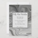 Um quadro de prata na moda e texto num convite de aniversário de mármore branco, cinza e prata.