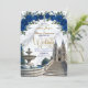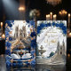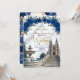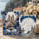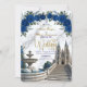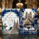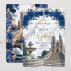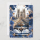 Defina o tom para uma celebração majestosa. Este design apresenta uma cena romântica de catedral com flores em azul real e detalhes em dourado falso, perfeito para uniões de contos de fadas.