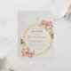 Este convite de batismo floral elegante tem uma moldura dourada irregular com buquês de flores de orquídeas brancas e rosadas para cima e para baixo sobre dois hexágonos dourados que se sobrepõem a um fundo de mármore branco, com uma cruz dourada no topo. O nome do bebê é escrito em uma fonte caligráfica elegante. Todo o texto tem uma cor amarela dourada, como a moldura dourada.