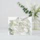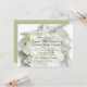 Convite de casamento branco com um tema à beira-mar para cerimônias perto do oceano. Uma grande estrela do mar branco/estrela do mar está presa a uma flor branca de hydrangea bonito e é o fundo de linhas de texto verde de sábio personalizado. Texto tradicional em verde escuro com letra maior de script para nomes e título de local. O reverso é verde de sábio sólido.