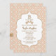 Marroquino francês elegante e bonito os convites inspirados do chá de fraldas com uma luz hued morna de repetição coram design geométrico pálido cor-de-rosa do teste padrão do coral e do ouro e flourishes florais hued do ouro. Esta vista de gama alta e luxe convida é perfeita para o chá de fraldas temático das noites formais, exóticas, marroquinas, árabes ou do Aladdin para um bebé. A parte traseira dos estes costume, quadro extravagante convida pode ser personalizada com o nome das mamães para ser e nome do evento na forma do quatrefoil e no design impresso do olhar da fita. Trabalhos de arte e © Chrissy H. Estúdio do design, LLC. Todos os direitos reservados.