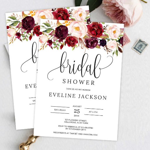 Blush Burgundy e Blush Pink Floral Chá de panela, Profundo convite para chás de casamento de rosa vermelha com Maroon