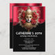 O rosto de uma mulher bonita com pele branca de porcelana e lábios rubis vermelhos está vestindo um topo vintage de roflo de ouro e uma máscara de ornamentado de ouro falsa que tem grandes plumas e rosas vermelhas em seu rosto. Ela é colocada contra um fundo vermelho e preto moderno e profundo cintilante que tem modelos de texto editáveis brancos para sua redação personalizada. Este gráfico aquarela parece brilhar e brilhar e é ideal para uma solteira, chá de panela, aniversário, doce dezesseis; marco ou quinceanera. Simplesmente personalize os modelos de texto editáveis para se adequar à sua ocasião especial.