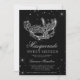 Um doce moderno, chico e glamouroso dezesseis, com uma máscara de mascarada com brilho prateado desenhada à mão com faíscas de diamante reluzente prateado sobre um fundo preto editável com brilho prateado na parte de trás.