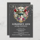 O rosto de uma bela mulher com pele branca de porcelana e lábios rubis está vestindo uma máscara de olhos inspirada em uma tela azul metálica e ouro falso que é enfeitado com rosas brancas e burro, detalhe decorativo de ornamentados e um fundo azul pálido e borrado contra uma cinza escura que tem brilho fino prateado caindo ao longo da borda superior. Modelos brancos editáveis aparecem abaixo do elegante gráfico de aquarela ai, que pode ser personalizado para se adequar à sua ocasião especial. São ideais para uma solteira, aniversário, 16 doces; marco ou quinceanera. Simplesmente personalize os modelos de texto editáveis para se adequar à sua ocasião especial.
