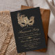 Na moda moderno convite para 15 de Mascarada. A caligrafia elegante escrita à mão combinada com uma fonte moderna sobre um fundo preto escuro complementa-se e parece harmoniosa ao mesmo tempo.