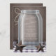 Incrivelmente belos convites para casamentos inspirados no sul, com a ilustração de um jarro de mason amarrado no pescoço, estrelas rústicas do Texas deitadas no pé do pote, uma mesa de gingham branca e roxa, sobre um fundo castanho vintage. A parte traseira desses convites oferece a opção de imprimir também o tempo de recepção e o local.