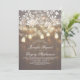Luzes de cordas, vagalumes, jarros de pedras, rendas e convite para festa de noivado de madeira de celeiro rústico.