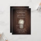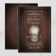 Um convite de casamento rústico com uma ilustração no centro de um jarro mason de hálito de bebê. O fundo é a prancha de madeira inspirada. Personalize o texto.