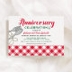 Convites de celebração de aniversário de casamento divertidos e únicos com um tema de comida italiana - perfeito para um restaurante italiano clássico ou festa de jantar de massa caseira. O design apresenta um garfo e uma colher enrolados com um fio de espaguete e um padrão de toalha de mesa xadrez vermelha e branca. Cores do design: vermelho, verde, branco e preto.